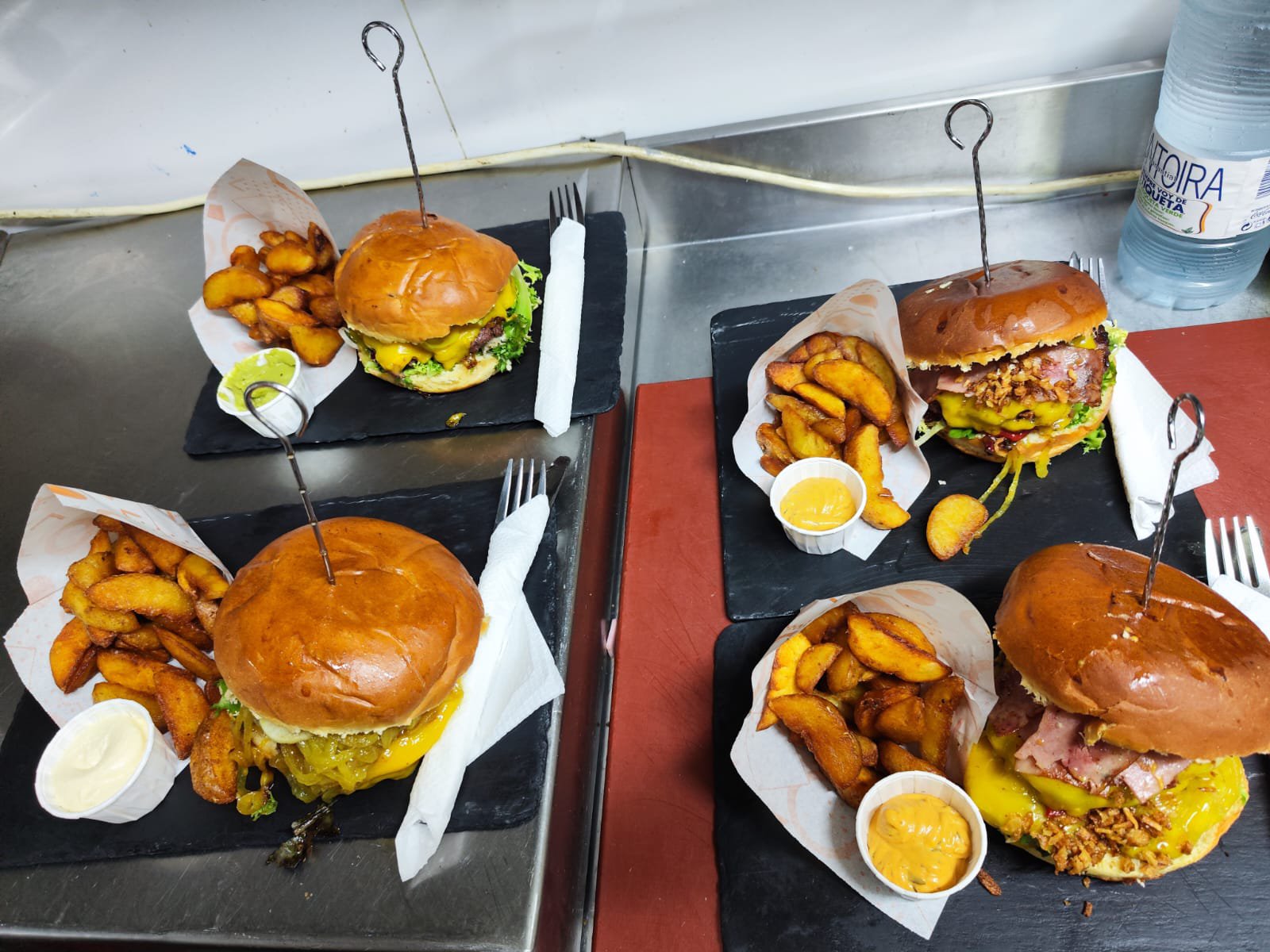 Ensalada gourmet , carne de ternera , queso chédar ,cebolla caramelizada , alioli y papas deluxe
